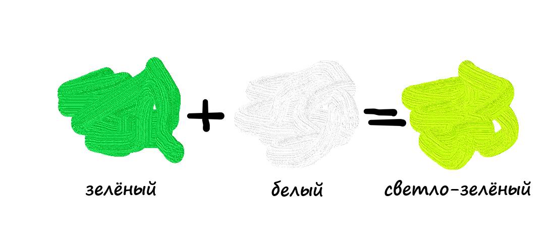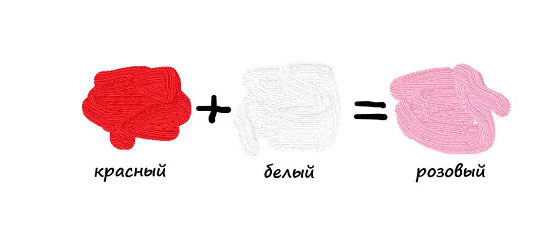 Например, если мы в белую добавим красную, то получим розовую краску; если белую добавим в синюю, получим голубую, а если в голубую краску добавим немного зелёной, то получим бирюзовую. Так можно составлять и получать разные цвета.