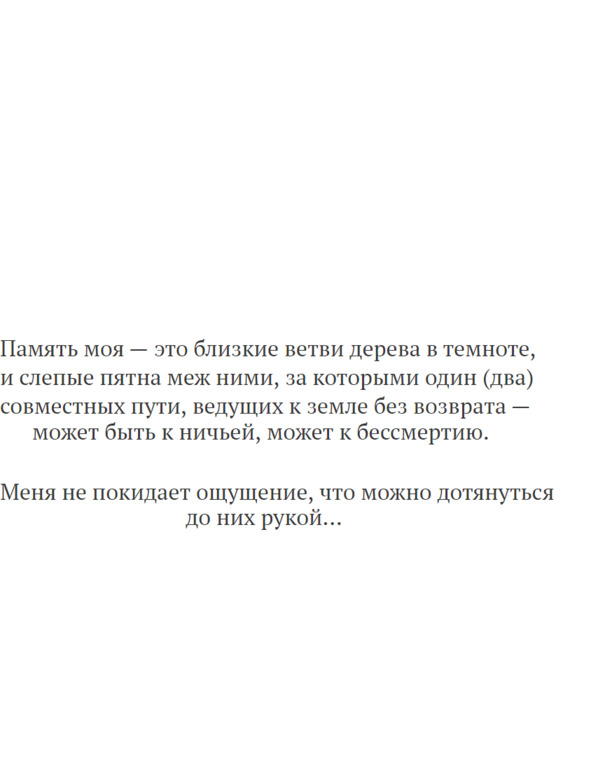Ты, который с нейУже более полугода,Чьё появление мне ясней,Чем предугаданная погода,Чьё умение упрощатьВсё до милейшей чуши,Вроде правописания «ча» и «ща»Или звука струны, послушай.На клочке земли, где в осеньКартошку сбрасывают тюками,И на рёбрах пылает «восемь»,Я заложил камень.Чтобы в шкуре воспоминаний,За свои невидимки баки,Дырявить его зубами,Слизывая соль и накипь.Ты, который с нейКак будто уже давно иНавсегда. Не заметь – во снеОна дремлет к тебе спиною.А когда она с этих местУдалится, новым влекома,Я пошлю тебе данный текст —Прочитай и отправь другому.II. Близкие ветви дерева