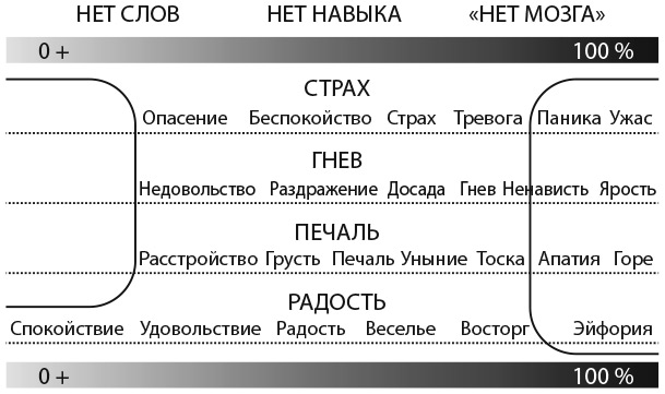 Получается, что основные базовые эмоции практически невозможно осознавать по двум причинам: в одной части шкалы нет слов для их называния, в другой – нет осознающих отделов мозга. То есть они есть, но отключены. И только в середине континуума есть и то и другое, и тут мы могли бы эти эмоции осознавать. Но выясняется, что там у нас нет навыка. Нас никто никогда не учил этому так же монотонно и планомерно, как, например, писать в прописи или считать в столбик. В детстве многим из нас часто говорили, что эмоции нужно прятать и подавлять. Редко, а фактически никогда, кого-то спрашивали родители или учителя: «Осознай, пожалуйста: что ты сейчас чувствуешь? Назови свою эмоцию».