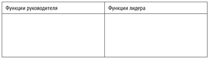 Напишите на листе бумаги в столбик перечень функций руководителя и функций лидера (на тренингах люди это делают в группах).