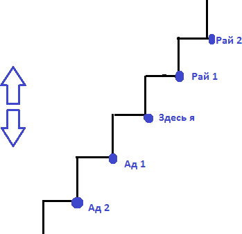На рисунке условно показано, что относительно нас в иерархической лестнице, нижняя ступенька воспринимается, как ад, а ступенька вверх, как рай. Например, для человека родиться в следующей жизни в животном царстве на Земле – это ад, а в высших мирах – рай. Восходить приятно, а попадать ниже, особенно намного ступеней ниже, воспринимается очень отрицательно, как попадание в ад или тюрьму. Чем выше иерархическая ступень, тем больше возможности контроля и влияния на окружающих существ, больше осознанности, больше ответственности, больше свободы, больше чувства радости и счастья.