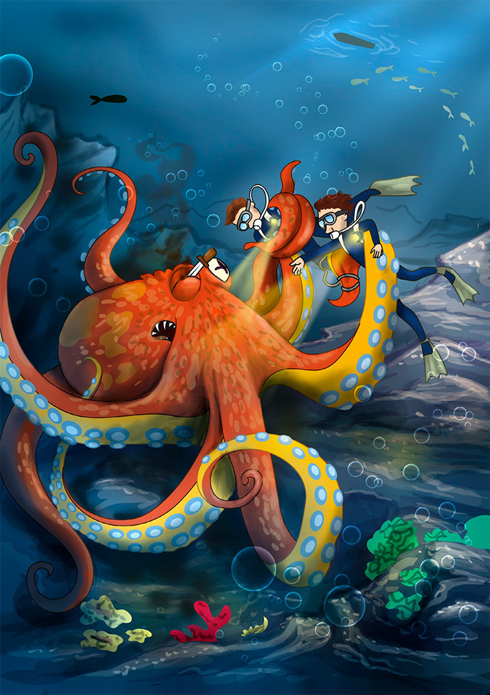 Но его товарищ, находившийся сбоку, просто исчез. Матвей испуганно оглянулся по сторонам и увидел большущего осьминога, который тащил Цыпу в своё логово за линией обрыва на дне. Чем больше Цыпа барахтался и отчаянно пытался освободиться, тем крепче морской хищник сжимал его двумя из восьми своих щупальцев.