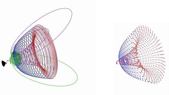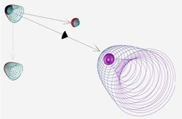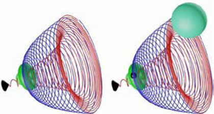 На фиг. 2.9 показана упрощённая схема процесса индукции поляризованного магнитного монополя (чёрный шарик) в замкнутом объёме электрона пространственной разрядкой гравитационного монополя (зелёные шарики на красном внутреннем волноводе). После того, как в поле атомного ядра, магнитный монополь фотона поделился пополам (чёрный конус), он до полной остановки во время торможения превратился-зарядился в свой аналог, источник движения в замкнутом объёме – гравитационный монополь (зелёный шарик в центре на поверхности волновода), как процесс противодействия изменению скорости. Поэтому его структура аналогична структуре магнитного монополя (фиг.2.1). Однако некоторые его свойства отличаются от свойств магнитного. В отличие от магнитного он производит волновод из зёрен-гравпотенциалов без посредства участия других полей, т. е. без противодействующего электрического вихревого поля, как это происходит с магнитным зарядом фотона. Имеются и другие существенные отличия. В свободном вихроне фотона зарядка магнитного монополя находится в функции противодействующего предыдущему электрического монополя. В замкнутом вихроне электрона эта функция возлагается на гравитационный монополь. Общее для обоих – зарядка магнитного монополя происходит без возбуждения вторичных полей.
