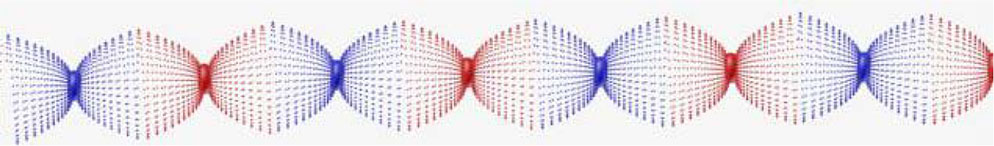 Такой переменный магнитный монополь становится носителем кванта индуктированной энергии и «транспортом» для переноса параметров первичного кванта. Другими словами, при самодвижении-разрядке он становится вихроном и развёртывает в пространстве[74] всю историю (информацию) изменения электрического поля в точке, где он родился. На ¼ длины волны (пучность) от первоначального местоположения первичные монополи – магнитный и противодействующий электрический исчезают, и через мгновение уже на ½ длины волны (узел) возникает вторичный монополь, идентичный по величине (магнитный) и противоположный по знаку первичному. Процесс повторяется заново, но с противоположным знаком.