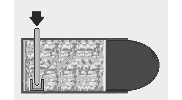 Схема шпилечного патрона. У него капсюль внутри порохового заряда и шпилька – для удара по капсюлю.
