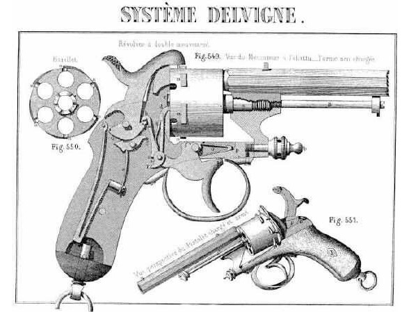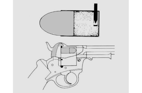 У револьвера Лефоша тоже был барабан под патроны, но заряжался он с казенной части барабана и в особом положении, когда патрон поворачивался и укладывался в небольшую выемку, гнездо на барабане под шпильку. Да и сам боек затвора был длинней и таким, чтобы он мог сверху ударить по шпильке, когда барабан останавливался напротив ствола. То есть тот же кольт, только боек бьет не по задней части барабана, а сверху барабана – по выемке в нем, где выглядывает шпилька патрона.