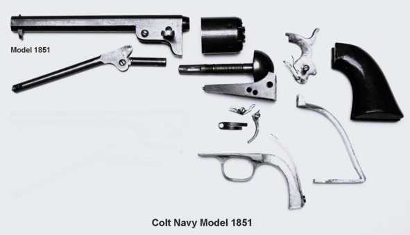 Детали револьвера Кольт модели Navy. Ниже ствола – рычаг для уплотнения заряда снаряженной камеры барабана.