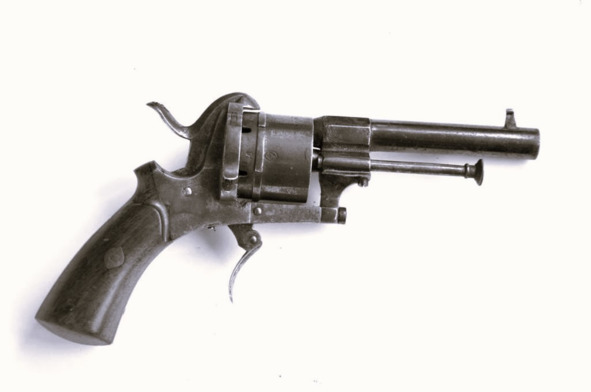 Конструкция револьвера Лефоша: слева – барабан с наружными гнездами под шпилечный патрон.
