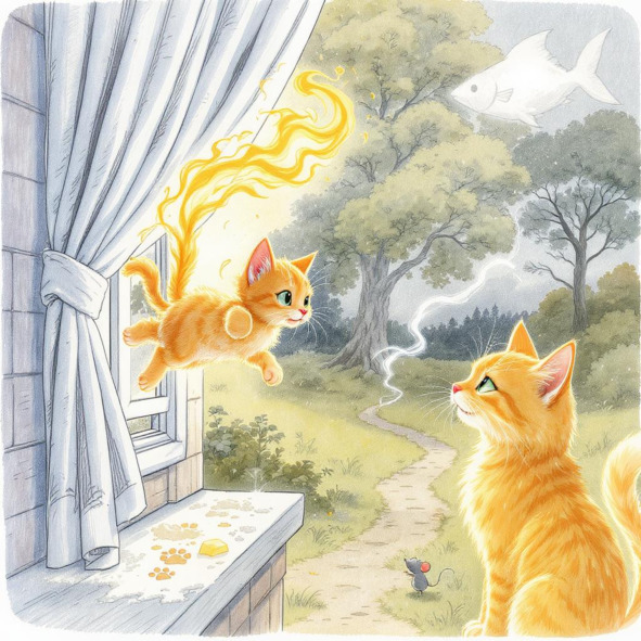 В тот же миг всё вокруг завертелось! Листья на дереве зашумели громче, ветер подхватил Пушика, и он почувствовал, как отрывается от земли. В последний момент он успел заметить, как мама-кошка выглядывает из-за калитки сада, её глаза круглые от ужаса.