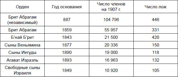 Переселявшиеся в Америку евреи в основном происходили из районов, где они жили в рамках кагальной организации. Вряд ли эта организация полностью сохранилась при переселении за океан. Но, с другой стороны, трудно себе представить, чтобы выкованная веками существования в этой системе традиция полностью исчезла. Действительно, в Америке возникает ряд еврейских организаций – например, в 1906 создается Американский Еврейский Комитет, руководителем которого был Яков Шиф, владелец одного из крупнейших американских банков «Кун, Леб и Ко». Большое число еврейских иммигрантов было объединено в организации, называемые «орденами». Что из себя представляли эти организации, не вполне ясно. Они строились из «лож» и «капитулов», что напоминает масонскую организацию. Но иногда утверждается, что сходство было чисто внешним – возможно, что здесь проявилась какая-то другая традиция. В «Еврейской Энциклопедии» приводятся следующие данные об этих орденах: