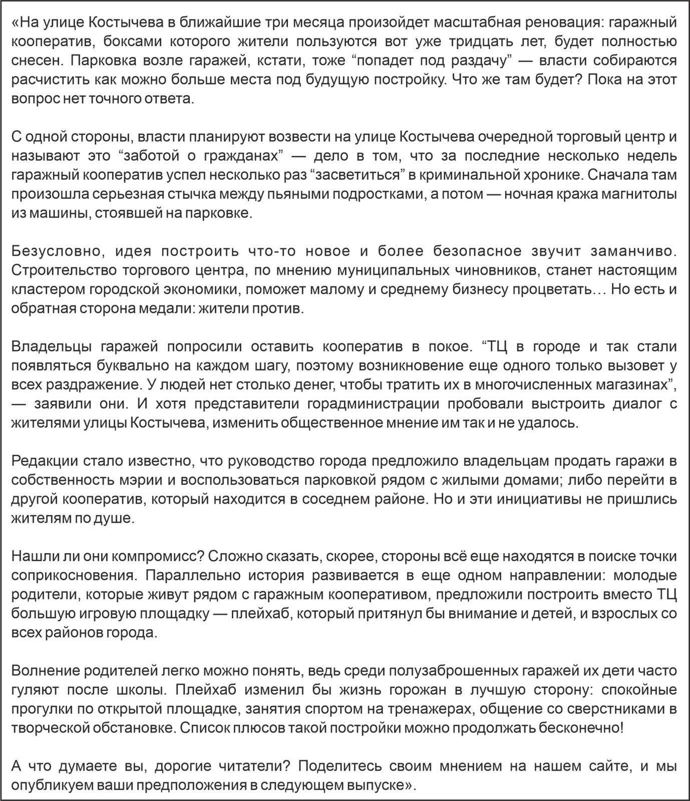 – Да нет же! Тебе в корне надо было по-другому написать. А так ты жителей только разозлила… Вон, спроси у Альберта, что о твоей статье думают собственники гаражей, ― он всё утро мониторит и подчищает плохие комментарии в соцсетях. Это ужас.