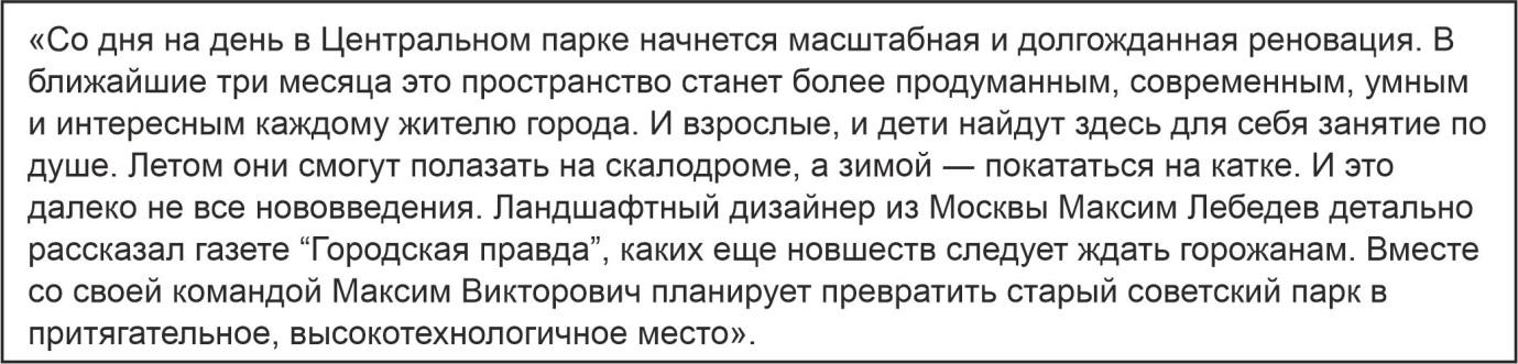 – “Концепция Максима Лебедева, или «Умный парк» как новая точка притяжения в городе”.
