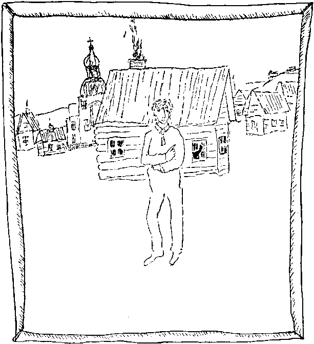 Бормочет себе под нос. Лицо у него желтое, и желтизна сползает с оконного переплета на улицу, ложится на церковный купол. Он похож на деревянный дом с прозрачной крышей.