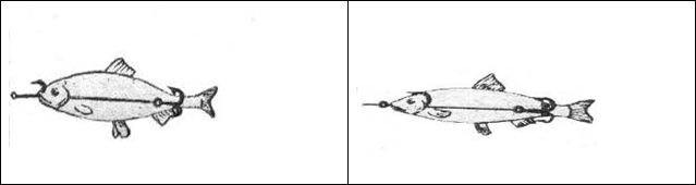 Рис. 4. Способы насаживания живцов на снасточки из 2-х крючков.