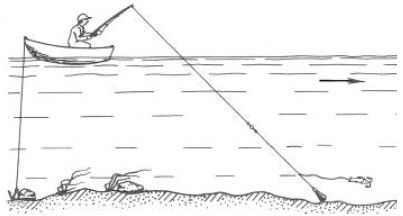 Техника ловли проста: рыболов выплывает на лодке на облюбованный участок реки и становится на якорь (чаще всего на границе тихой воды и быстрины, рядом с омутом или ямой), разматывает наживленную снасть, и, когда грузило касается дна, ставит катушку на тормоз. Грузило вытягивает леску под меньшим или большим углом (в зависимости от силы течения), а живец получает возможность гулять у самого дна на поводке. Если поклевок нет, грузило слегка поднимают над дном, позволяя течению относить его дальше, – и увеличивают таким образом облавливаемую зону. Но если поклевки судаков начались в 15–20 метрах от лодки, имеет смысл сплавиться поближе к стае, подняв якорь либо вытравив его веревку (если, конечно, позволяет глубина – на глубинах меньше 4 метров зависать над головой судаков не стоит, лучше ловить в некотором отдалении).