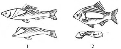 Рис. 3. Приготовление «резки»: 1 – из хвостовой части узкой рыбы; 2 – из боковой части широкой рыбы.