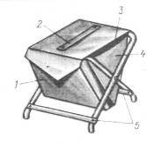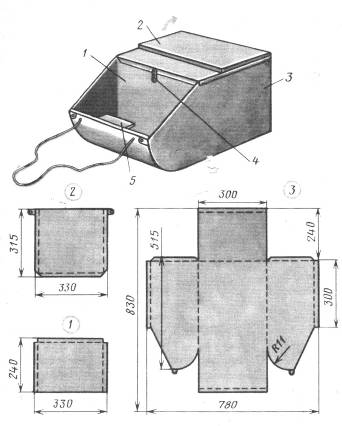 Рис. 12. Самодельный ящик-санки конструкции Г. Балуева: 1 – передняя стенка (те же размеры и форма у внутренней перегородки), 2 – крышка ящика с сиденьем из пенопласта, 3 – корпус из листового дюраля; 4 – защелка-затвор; 5 – ручка-полка из семислойной фанеры.