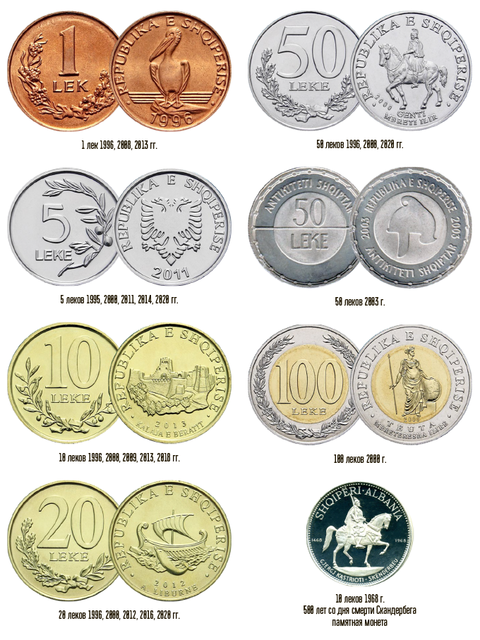 На монете в 10 леков изображена крепость XIII века в городе Берат, хотя городское поселение и первые укрепления появились там с IV века до н.э. Выходит, что почти все современные монеты Албании посвящены древней иллирийской тематике.