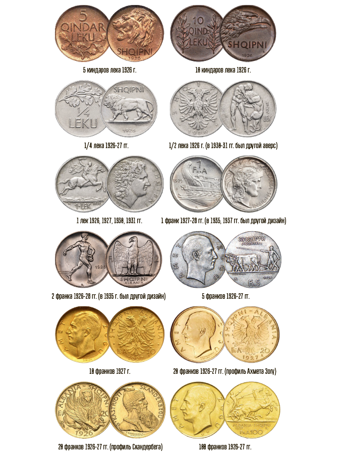 В 1928 году Албания становится королевством, а Ахмет Зогу – королём. Меняется герб, поэтому поменяется и аверс монеты 1/2 лека, а монеты номиналом 1 и 2 франка поменяются полностью: на аверсе – герб, на реверсе – всё тот же профиль Ахмета Зогу. В 1935 году чеканятся монеты номиналом 1 и 2 золотых киндаров (аверс – орёл, реверс – номинал).
