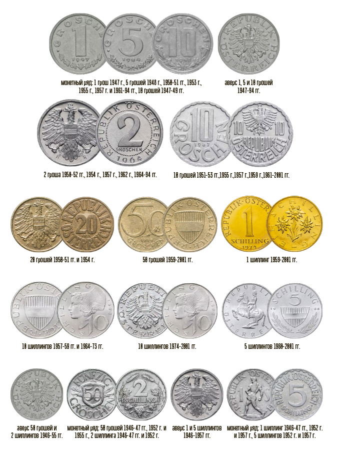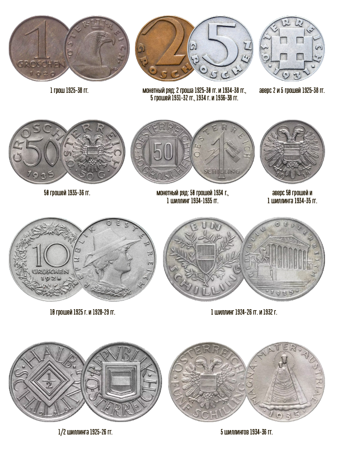 В 1925 году 10000 австрийских крон обменивают на 1 австрийский шиллинг. 1 шиллинг = 100 грошей. На всех монетах есть слово «Österreich», впервые оно упоминается в документе от 1 ноября 996 года и с древненемецкого переводится как «Восточное государство», от этого слова произошло название «Австрия».