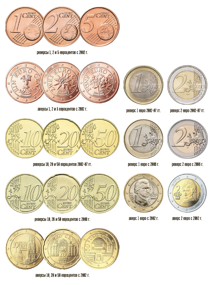 На монетах малого номинала изображены альпийские цветы: альпийская горечавка (1 евроцент), цветок эдельвейса (2 евроцента), альпийская примула (5 евроцентов), – занесённые в Красную книгу и символизирующие заботу об окружающей среде. На средних номиналах – архитектурные памятники Вены: Собор Святого Стефана (готика, 10 евроцентов), Бельведер – дворцовый комплекс, в котором 15 мая 1955 года состоялось подписание Декларации независимости Австрии (барокко, 20 евроцентов), Венский сецессион – здание объединения венских художников в эпоху ар нуво (модерн, 50 евроцентов).