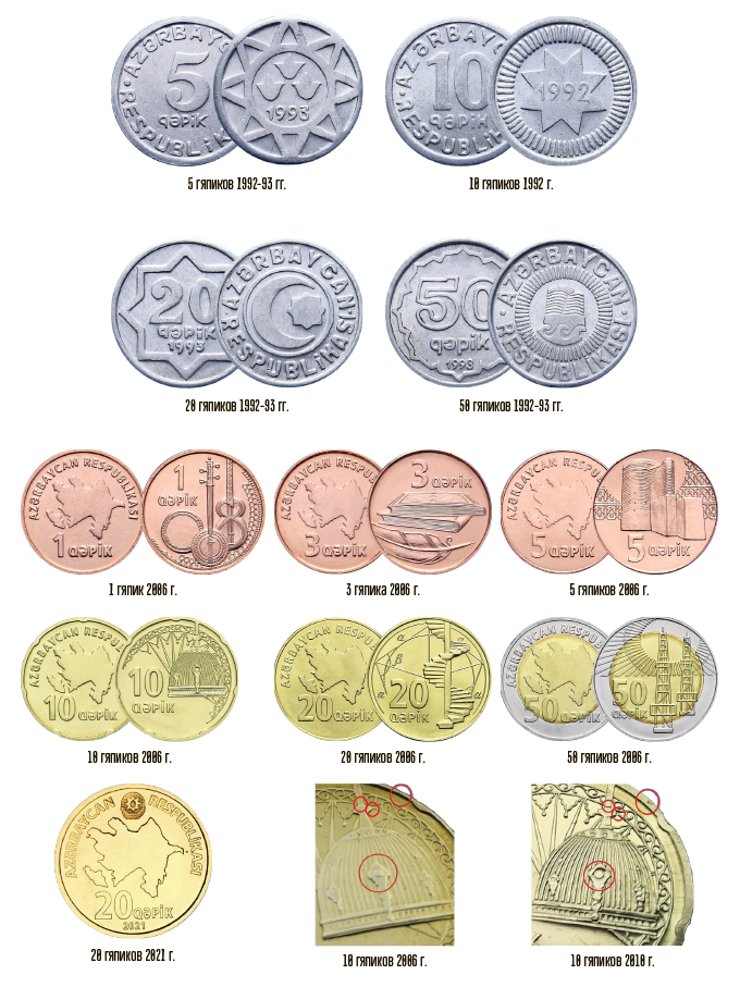 Первые монеты были отчеканены в 1992-93 годах. На одной из сторон всех монет указан номинал, на другой – различные изображения. На 5 гяпиках – 3 огонька в центре восьмиконечной звезды, 10 гяпиков – восьмиконечная звезда, 20 гяпиков – полумесяц и восьмиконечная звезда, 50 гяпиков – Девичья башня в Баку. Монеты номиналом 5 гяпиков (бронза), 20 гяпиков (бронза) и 50 гяпиков (никель) не попали в обращение, их распродали в качестве сувениров. Кстати, обычно происхождение слова «гяпик» связывают с русским словом «копейка».