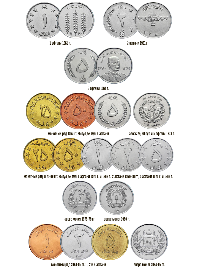 Впервые человек начал выращивать пшеницу 10 тысяч лет назад, одна из теорий предполагает, что это произошло как раз на Ближнем Востоке. И с тех пор, как пшеница «одомашнила» человека, в Афганистане мало что поменялось. Каждая из монет 1961 года отдаёт дань почтения пшенице: 1 афгани – 3 колоса пшеницы на аверсе, 2 афгани – орёл на фоне солнца на аверсе и номинал в венке из звёзд и колоса пшеницы на реверсе, 5 афгани – бюст короля Мухаммеда Захир-шаха на аверсе и номинал в венке из пшеницы на реверсе.