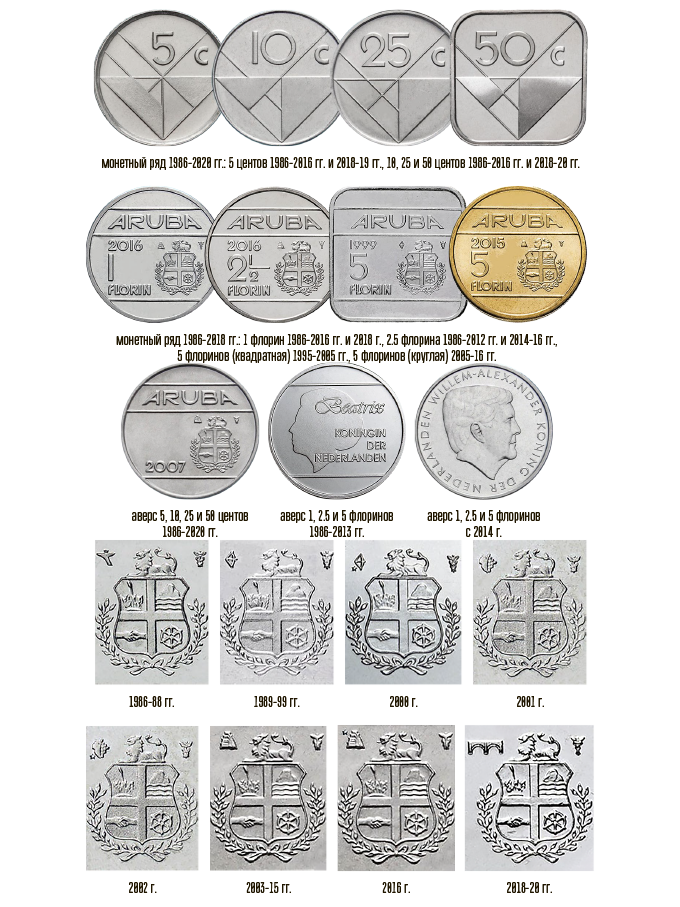 А символы слева от герба – это знаки минцмейсторов (директоров) монетного двора: 1) 1986-88 гг. – наковальня, Jan de Jong; 2) 1989-99 гг. – лук со стрелой, Chris van Draanen; 3) 2000 г. – лук со стрелой и звезда, Erik J. van Schouwenburg; 4) 2001 г. – виноград, Robert Bruens; 5) 2002 г. – виноград и звезда, Maarten Brouwer; 6) 2003-2016 гг. – парусник, Maarten Brouwer; 7) 2016 г. – парусник и звезда, Kees Bruinsma и Ted Peters; 8) с 2018 г. – мост Святого Серватия, Stephan Satijn. Некоторые минцмейстеры добавляли только звезду, потому что они были на своём посту в качестве временно исполняющего обязанности, а когда человека окончательно утверждали на должность, он придумывал свой знак. Внимательный читатель заметит отсутствие 2017 года. В этот год монеты Арубы не чеканились.