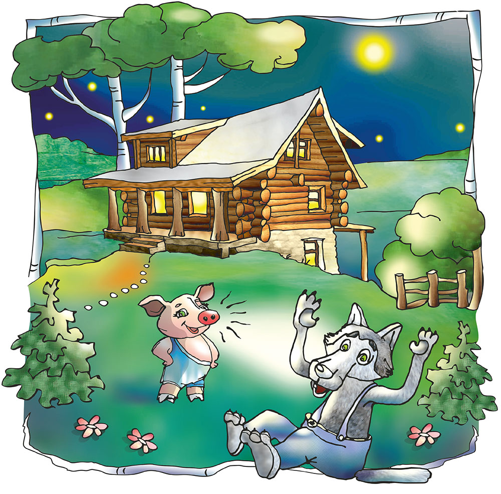 Другие пятачки, услышав, где Волк спрятал их братца, вызволили его и все стали неподалёку появляться по одному то там, то сям. Что было с Волком! Только он хотел поймать одного из поросят-братьев, как сзади его окликал другой. Он бежал за вторым, как появлялся третий. Так Волк долго бегал по опушке леса и везде его окликали поросята с алыми пятачками, которые светились, как фонарики, то из-за куста, то из-за дерева, то на самой опушке.