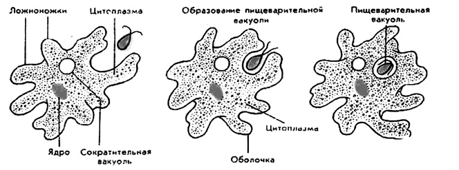 В пищевой рацион амеб входят водоросли иногда больших размеров, чем амеба. Пища, поступившая внутрь тела, переваривается в пищеварительных вакуолях, которые возникают вместе с приемом пищи.