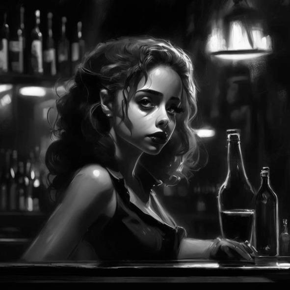 В глаза бросилась смазливая голубоглазая девица дешевого вида. Лицо было испорчено ярким макияжем. Грудь вульгарно вздымалась из декольте. Она, капризно поджав губки, безнадежно смотрела на черную стеклянную бутылку, стоявшую подле нее на стойке.