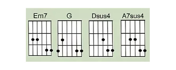 Кроме этого, например, лично у меня есть несколько аккордов, которые я считаю своей «визитной карточкой». Среди таких аккордов я хотел бы выделить A7sus4 и его производные Em7 G Dsus4