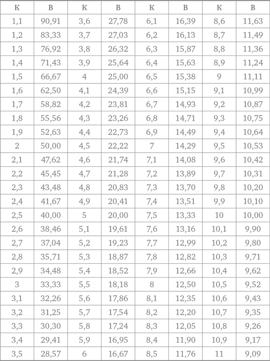 Чтобы узнать отрицательный американский коэффициент, нужно –100 поделить на разность десятичного коэффициента и единицы: