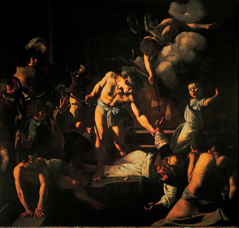 Караваджо приступил к работе над «Мученичеством святого Матфея», который был убит по приказу эфиопского царя у подножия алтаря. Как предписывалось, Караваджо пытался изобразить глубокое пространство церкви, в которой было совершено убийство, толпу свидетелей, вознесение мученика на небеса, и – наверное, впервые в его карьере живописца – работа застопорилась. Предписания сковывали его. Тогда он отказался от глубокого пространства и тем более от большой толпы действующих лиц. Вся драматическая сила его картин основывалась на близости персонажей к зрителю, а не на их удаленности, на компактности, а не на величественных пространствах. Он добивался того, чтобы зритель отождествлял себя с происходящим перед ним. Но как можно отождествить себя с толпой?