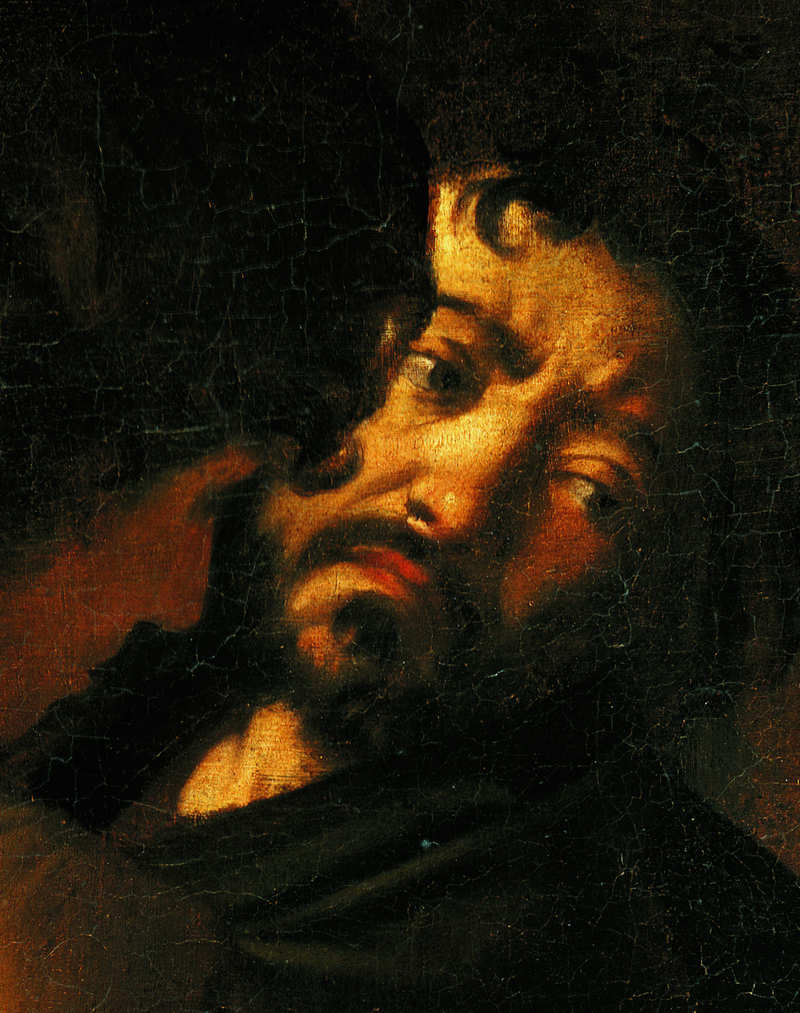 Мы, смертные, остаемся где-то посредине, мечась и крича вместе с персонажами картины (ибо в ней столько же шума, сколько тишины в «Призвании»). Свет, мелькающий, словно проблесковый огонь, перебегает с фигуры на фигуру и с лица на лицо, усиливая всеобщую панику. А позади толпы, примерно с того же расстояния, что и мы, но из глубины картинного пространства за происходящим наблюдает какой-то человек. Волосы его растрепаны и спутаны, он нахмурен и обливается потом. Караваджо изображает самого себя испуганным грешником, который знает, что надо немедля бежать, чтобы спасти свою жизнь, но не может оторвать глаз от кровавого зрелища. Единственным оправданием его присутствия служит то, что он держит фонарь и является, таким образом, вопреки своей природе, несущим свет.