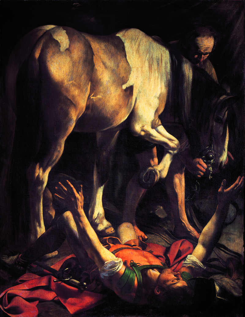 В то время как образ Петра в церкви на Пьяцца дель Пополо – вполне справедливо – связан с народом, Павел соотносится с представителями власти. На обеих картинах художник обходится с учениками Христа не очень лестно: предтеча богатых и напыщенных пап показан в момент своего величайшего унижения, а непоколебимый эталон воинствующей веры изображен выброшенным из седла своей суетной власти, распростертым на земле и беспомощным. С последним из них связан переворот в сознании самого художника, который расстается с многовековой традицией иконографии Павла, с привычном образом седобородого старца, каким он представал и в его собственном раннем творчестве. На этот раз Караваджо уподобляет его, прежде всего, своим современникам, римским полицейским – молодым, со щетиной на подбородке, грубым, любящим приструнить щеголей, – с какими он и сам не раз затевал стычки. Изображая Павла молодым, художник подчеркивает колоссальную силу света, поразившего его. Это поистине ослепляющее тщеславие.