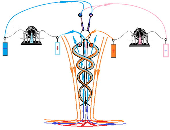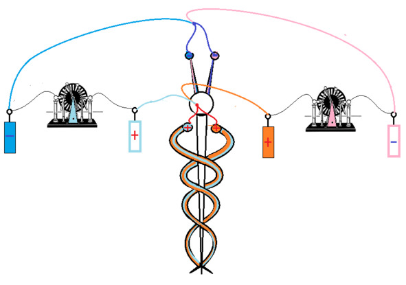Таким образом мы имеем двухкомпонентную бинарную систему питания техномагического устройства по типу Жезл Гермеса. Для этого используем два электрофорных генератора, каждый из которых работает со своим типом заряда.