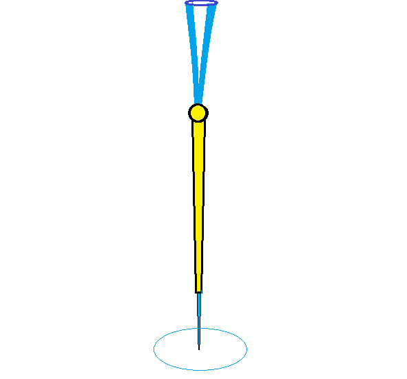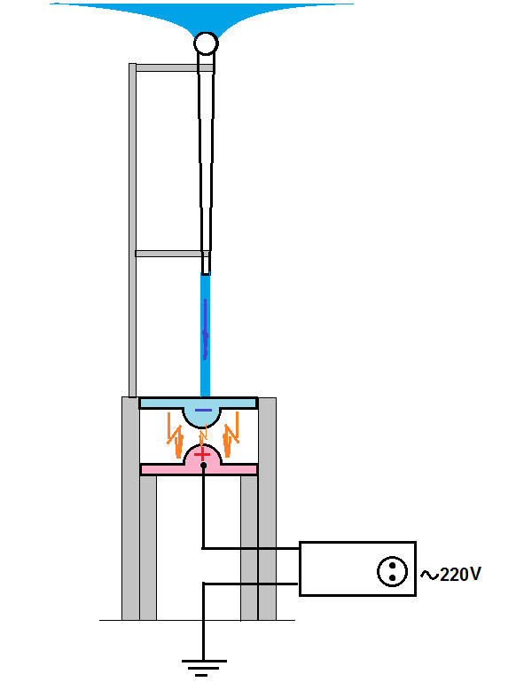 Жезл, в отличие от ЛЭП, он собирает в форму воронки вихря гравитоны, и скручивая их в пучок направляет на первую половинку разрядника. Вторая половинка связана с трансформатором, а через него с Землей. Если первая половина заряжается отрицательно, то на второй половине индуцируется положительный заряд. В зависимости от величины зазора в разряднике устанавливается напряжение пробоя с горящей дугой разряда. Убежать в Землю положительный заряд не может, – он удерживается отрицательным зарядом первой половины. Остаётся только одно – пробой и дуга.