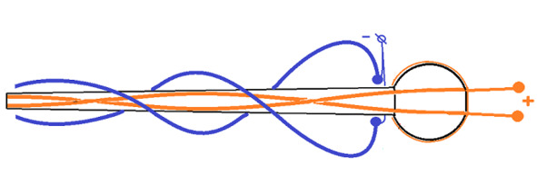 Вот таким способом и получается реальная электродинамика – движение потока зарядов по телу проводника. Один конец тогда будет иметь отрицательный знак потенциала – от него можно производить нагнетание или уплотнение. Второй конец будут иметь положительный знак потенциала. От него мы получаем разряжение, вытягивание зарядов, уменьшение плотности гравитонной компоненты эфира.