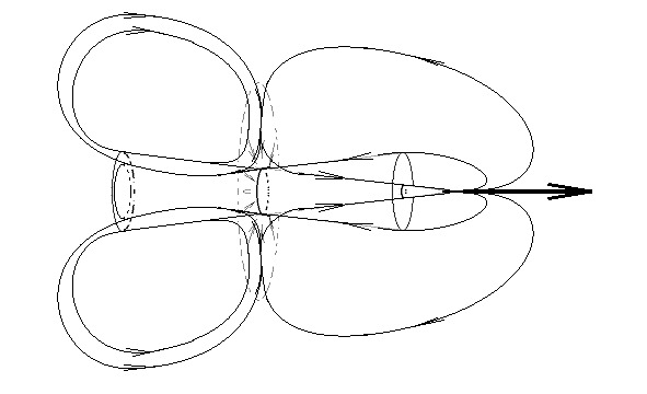 При достижении этого уровня замыкание потоков на себя уже не происходит, и окружной входящий поток фононов концентрируется в центре, и выходит в виде двух лучей в обе стороны.