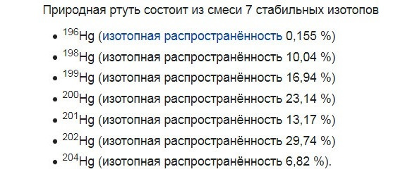 Этот список говорит о том, что если взять, условно, стакан ртути, то примерное распределение в этом стакане по изотопным разновидностям будут примерно такое.