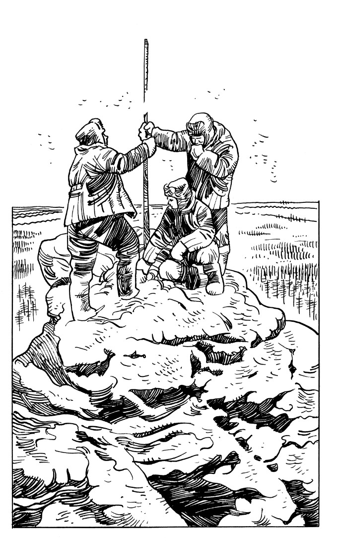 Когда они скрылись из виду, друзья помогли мне очистить снегом телогрейку от крови. Затем мы собрали разбросанные и помятые листы с картой и отряхнули их от снега. После чего принесли флаг, обмотали поломанное древко верёвкой, забрались на скалу и водрузили его на прежнее место.