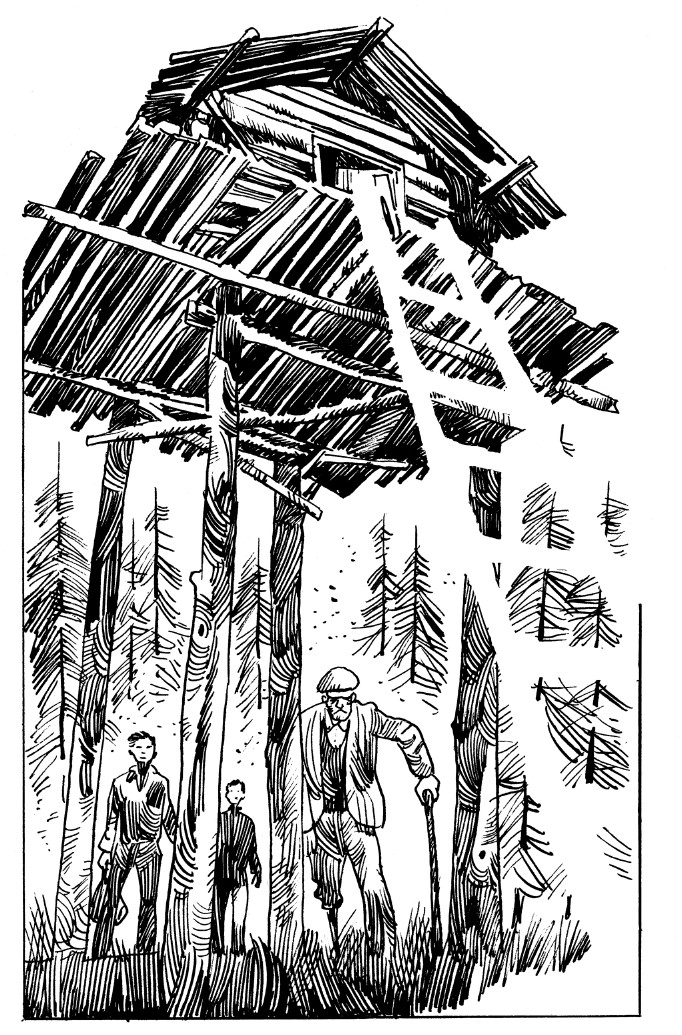 Остров Тополиный высокий и сухой, но раз в пять-шесть лет над Становым хребтом собираются густые, плотные тучи и идут затяжные ливни, не прекращающиеся неделями, и тогда остров полностью уходит под бурые холодные воды рассвирепевшей, вышедшей из берегов реки. Поэтому дед Илья не просто построил зимовьё на самом высоком месте острова, но и поставил его на опоры, в роли которых выступили стволы вековечных лиственниц. Дед Илья выбрал группу растущих рядом деревьев, спилил их на уровне метра от земли, обвязал пни поперечными балками и постелил на них дощатый пол. Стены соорудил из тонкомера[23], а крышу – из принесённых рекой досок. Получилось что-то среднее между избушкой и лабазом. К двери жилища поднимались высокие ступеньки.