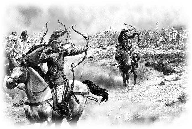 А на востоке, в степях Сибири и нынешнего Казахстана, жил другой многочисленный народ – скифы. Они тоже научились ездить верхом, были отличными воинами. Оружие у них было даже лучше, чем у киммерийцев. Копья, секиры, у каждого всадника два меча, длинный и короткий (его называли акинак). От вражеских ударов закрывались деревянными щитами, окованными бронзой или железом. В бою надевали шлемы, чешуйчатые панцири. Но в первую очередь, скифы были непревзойдёнными стрелками из лука, попадали в цель на полном скаку. Они изобрели «свистящие» стрелы, в наконечнике делали отверстие особой формы. Когда поднималась туча стрел, издающих в полёте свист, это вгоняло противника в ужас. У скифов было ещё одно важное отличие от киммерийцев. Их племена жили не сами по себе, а объединялись в большие союзы. Этим союзом правил общий царь, командовал общим войском.