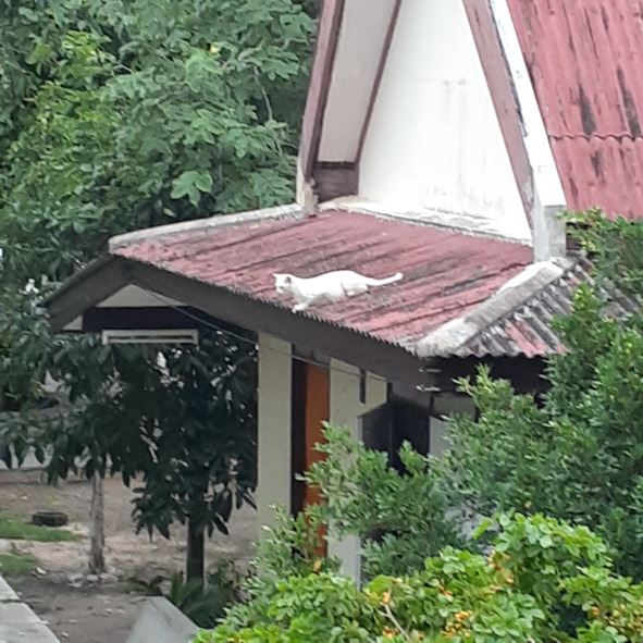 Кот периодически усаживался на самом краю карниза и принимался мявкать, стараясь привлечь к себе внимание. Орать громко и просить помощи ему не позволяла врождённая гордость и свободолюбие. Потом он отходил от своего обзорного пункта, исследовал крышу и пытался устроиться под карнизом второй крыши. Надо знать устройство кровли в тайских строениях. Они состоят из двух уровней, один, нижний, пологий, второй с крутыми скатами стоит на нижнем. Удобно спрятаться под карнизом верхнего и гулять по пологому скату нижнего, ветерок обдувает, обзор отличный. Один недостаток – сюда никто не приносит еды. Проорав весь вечер, он устроился на ночь под карнизом, а наутро, когда все монахи шли на чантинг в убосот, уселся на краю и ненавязчиво дал о себе знать. Люди немного посмеялись и указали ему на рядом стоящее дерево, которое протянуло толстую ветку к самому краю кровли. Кот посчитал такой путь слишком рискованным и отложил спуск на неопределённое время. Он опять улёгся и свесил голову вниз. Куры внимания на него не обращали, но плацдарм он занял, и склочный петух остался без любимого места.
