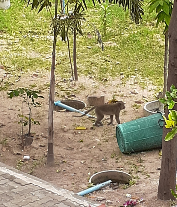 Приблудилась взрослая макака в начале лета. Довольно крупный самец сначала наведывался изредка к кухне большой салы, где в ван пхра раскладывают в монашеские чаши рис и распаковывают другие подношения по мискам. Но постепенно его визиты стали постоянными, не смотря на неудовольствие местных собак. Устроившись на козырьке крыши общежития, макак высматривал что-нибудь съестное. При чём, аппетиты у него были довольно изысканные. В один из дней Ог позвал Вансо, обезьяна сидела на козырьке туалета с явным намерением достать связку полузрелых бананов, сорванных в саду недавно. Вансо взял бананы и закинул их ближе к макаке на крышу. Тот выбрал себе парочку зрелых, съел и отправился восвояси. Как оказалось, скрылся ненадолго. Шипение кошек вызвало желание посмотреть, что происходит. А макак сидел рядом с мусорным баком, разбирая выброшенные упаковки. Испугавшись монаха, прыгнул на край пластикового бака, от чего тот с грохотом перевернулся и покатился вниз. А незваный гость выбрал себе запаянный пакетик с кетчупом KFC и тут же удалился.