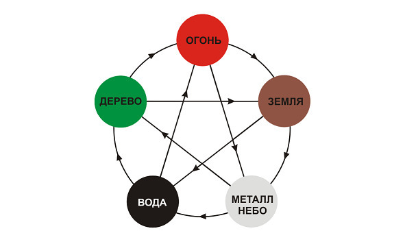 Механизм взаимодействий, если отвлечься от философского, околорелигиозного понимания, рассматривая только физическую плоскость, медицинский аспект, очень хорошо иллюстрируется в китайской традиции понятием «У-Син» пяти стихий. Рассмотрим его более подробно.