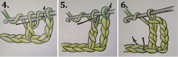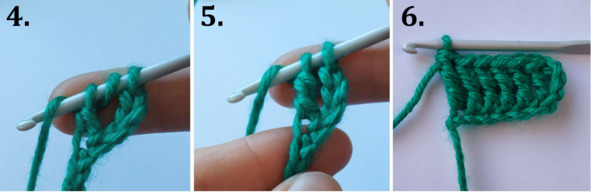 Пошаговые фото вязания столбика с двумя накидами: