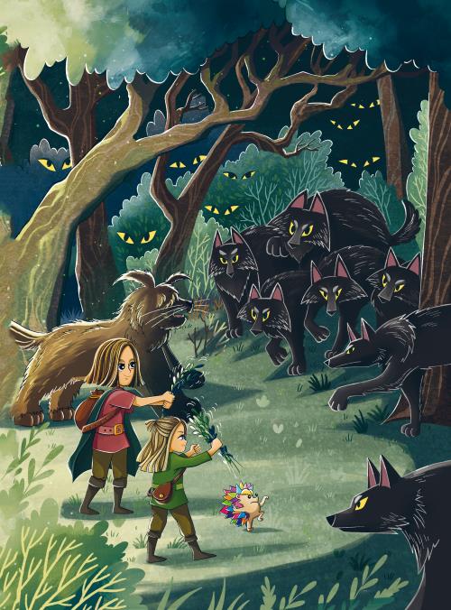 Они пошли дальше, стараясь не упускать из виду Иголочку. Казалось, до вечера ещё далеко, но почему-то становилось всё темнее и темнее – солнечный свет уже почти не пробивался сквозь густые кроны деревьев. Зато вокруг засверкали какие-то жёлтые огоньки. Они разгорались всё ярче и ярче. Деревья скрипели, тропинка утонула во мгле. И тут раздался зловещий вой. Это были волки. Десятки огромных чёрных волков начали медленно окружать путников. Барбос ощетинился и показал клыки, хотя прекрасно понимал, что одному ему не справиться с целой стаей. А волки тем временем окружили путников. Самый крупный из них вышел вперёд и прорычал: