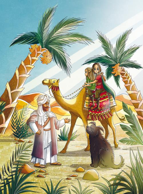 – Нет, мы не хотели отравить короля! Это неправда! – пытались протестовать девочки. Но всадники, не говоря ни слова, набросили на Барбоса верёвки так стремительно, что тот даже не успел оказать сопротивление. Девочек связали, положили, словно мешки, на гнедых скакунов и повезли в неизвестном направлении. Наконец среди песчаных дюн показались деревья, кустарники и невысокие постройки – пленников привели в оазис. Навстречу путникам вышел мужчина в просторных белых одеждах и с массивным белым тюрбаном на голове: